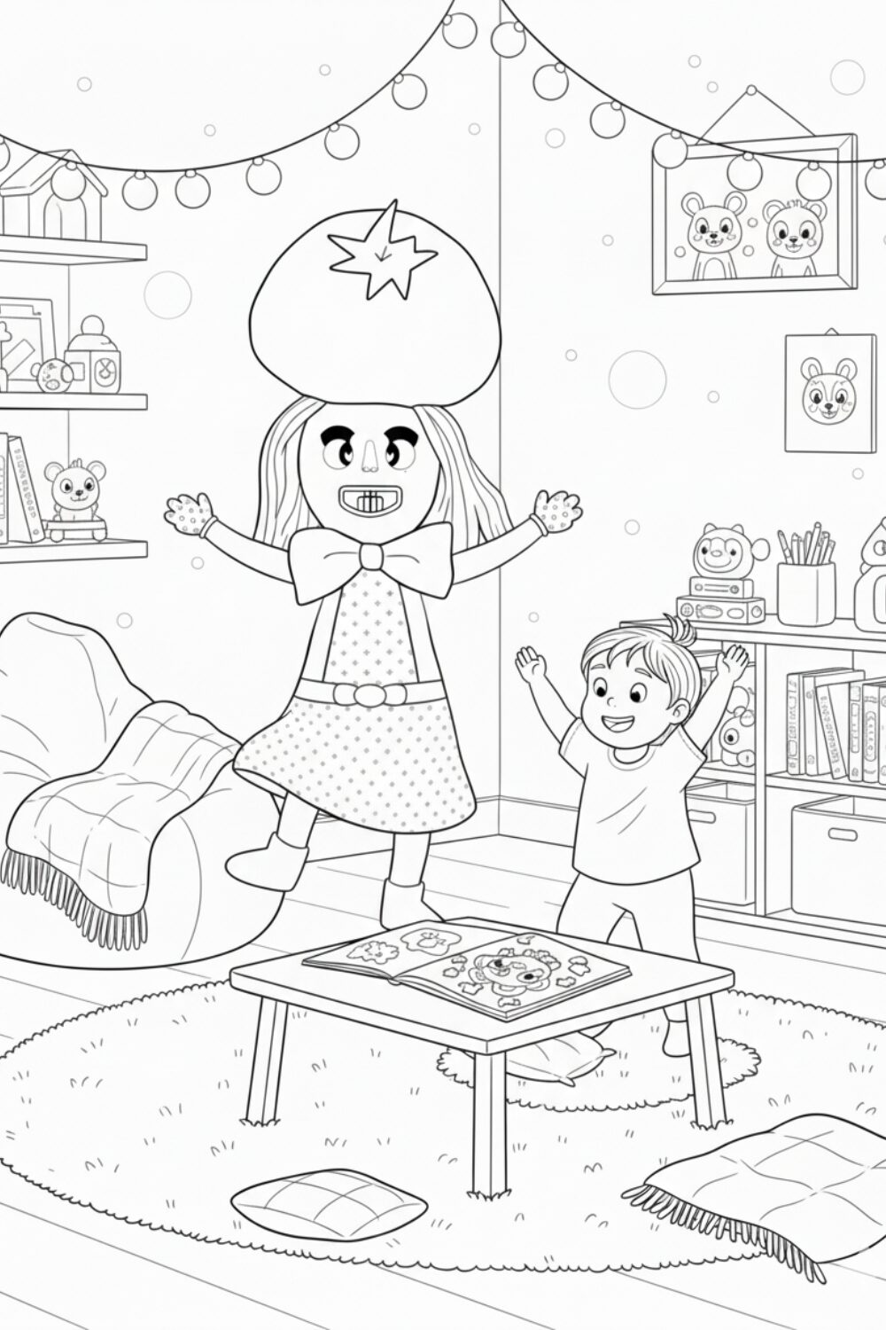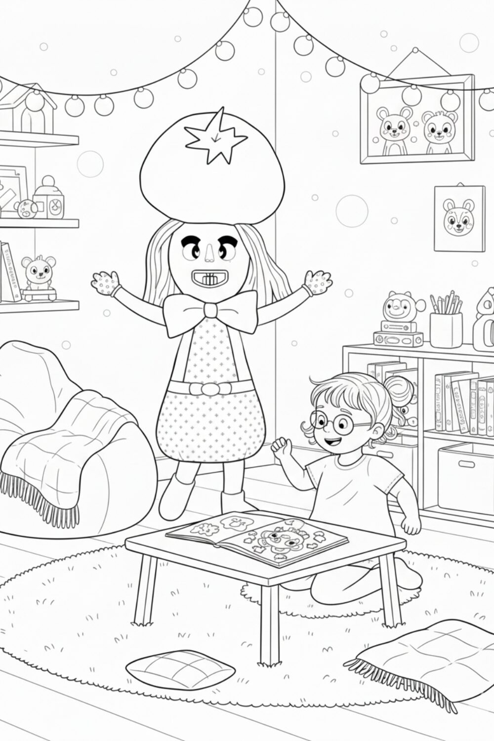 Meluna in a child's cosy room helping a child stay active, calm the child's mind, through colouring.