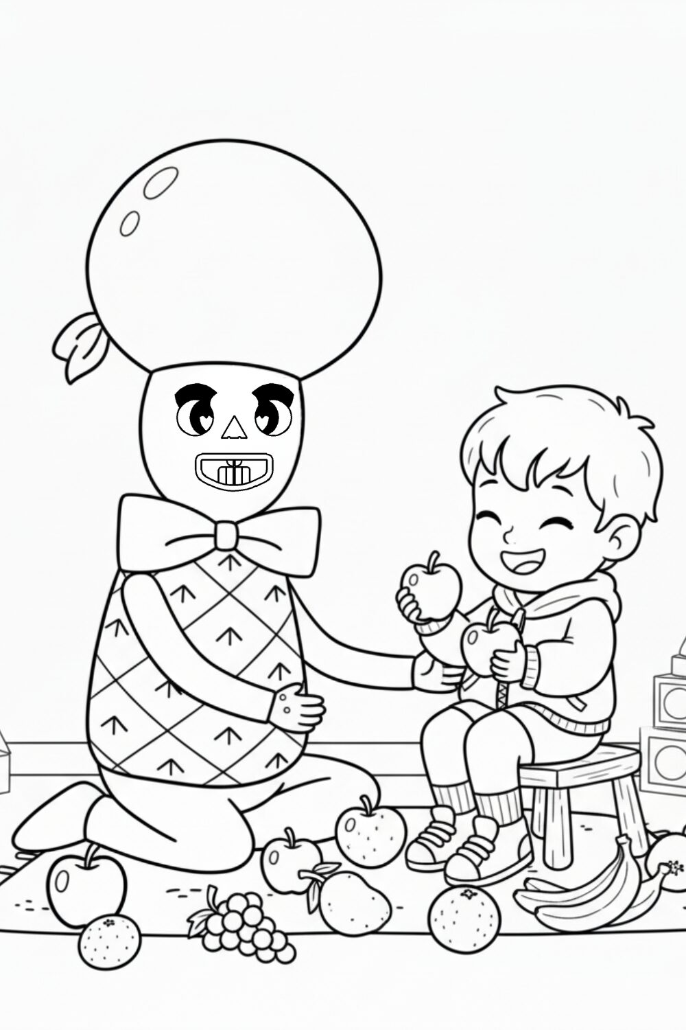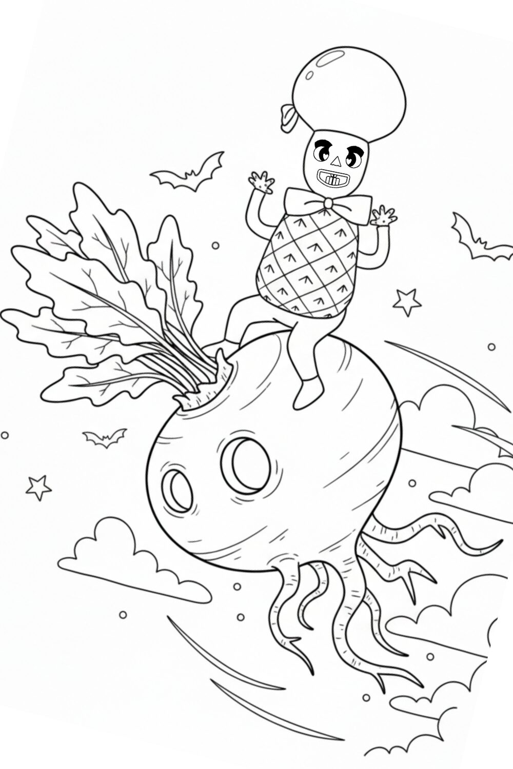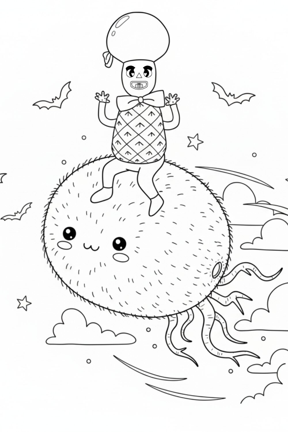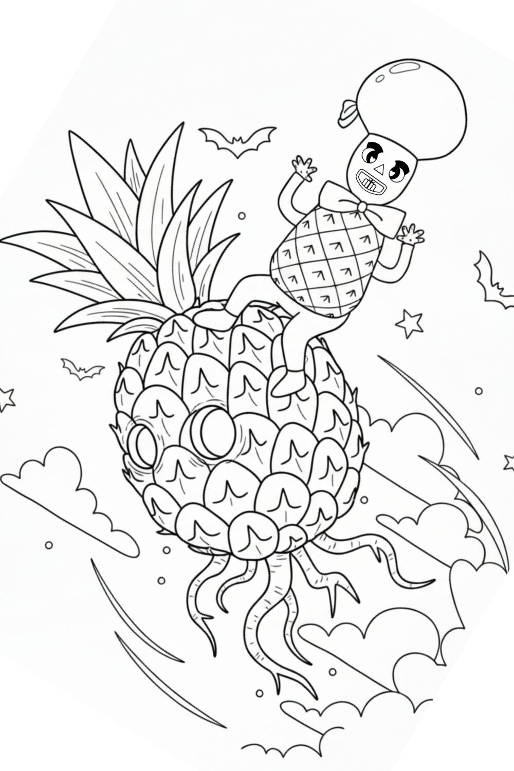 Myllo, whose body is a pineapple, flies on a giant pineapple in this tropical colouring page.