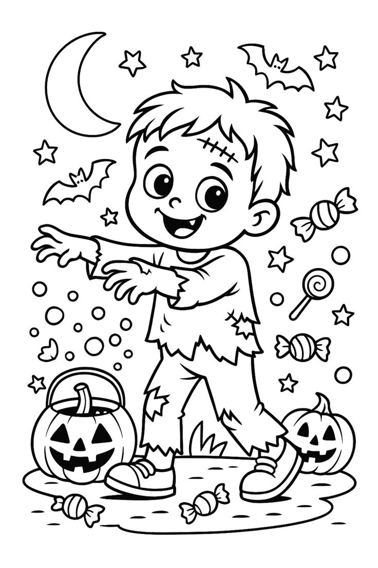 A child dressed as a zombie trick-or-treater with a candy pumpkin bucket.